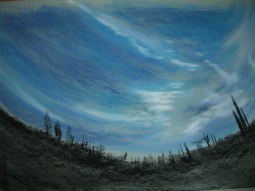 Grand Angle, tableau réalisé aux pastels secs sur un format 32X50cm, traduction d'une photo prise au fish-eye, où les couleurs et les formes se prêtent au jeu, dans un bleu lumière comme je les affectionne, un brin de mystère dans cette végétation comme calcinée...