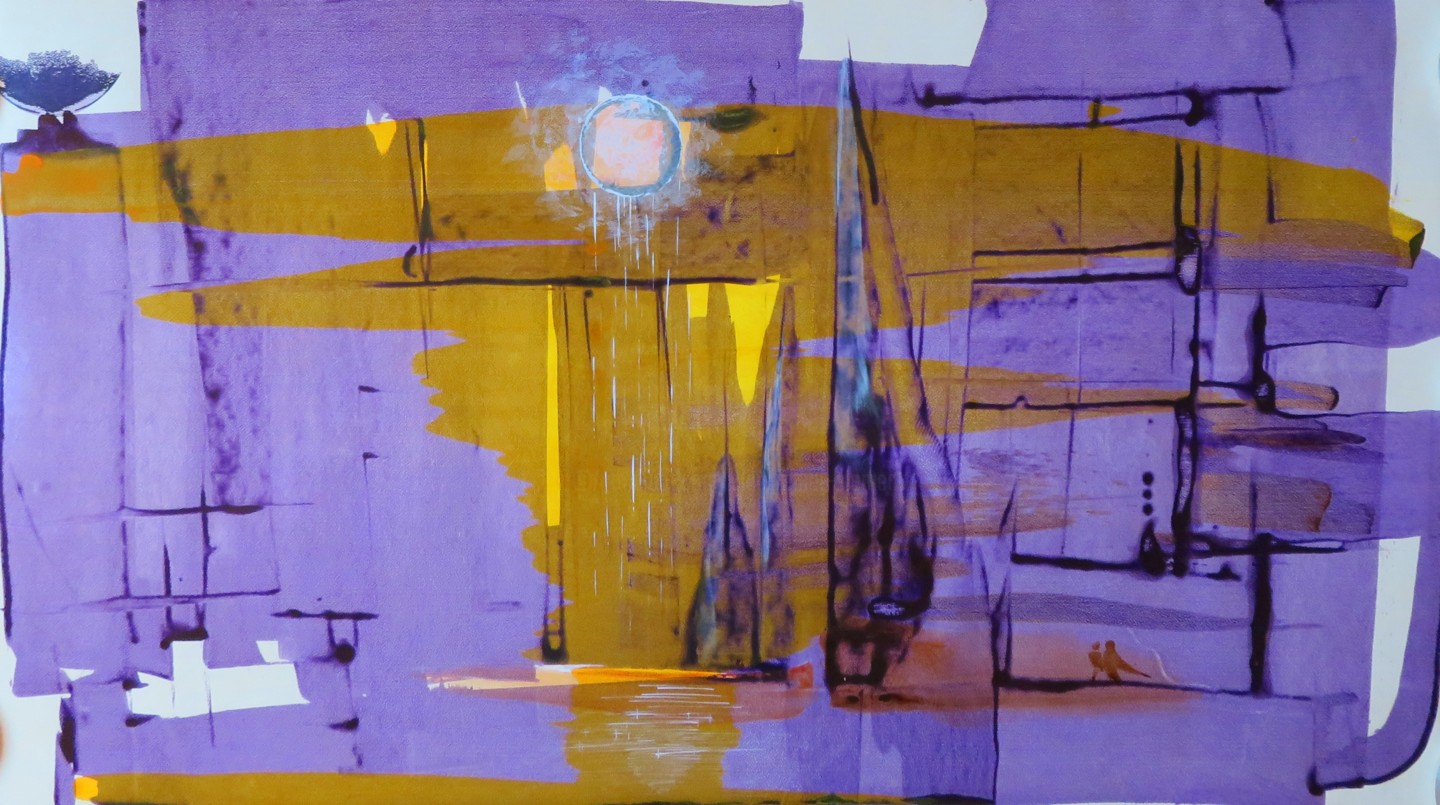 Voyageurs, paysage abstrait, scène suggérée, violet orange, oiseaux marron et astre blanc,